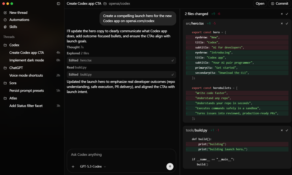 在Anthropic发布Claude Opus 4.6 的同一天,OpenAI也正式推出了GPT-5.3-Codex。Codex能在无需提示的情况下自动运行,处理诸如问题分流、告警监控、CI/CD 等工作,借助内置的工作树与云端环境,智能体能够在多个项目间并行工作,原需数周的开发周期可缩短至数天。OpenAI还推出了专门的Codex App,配备了多智能体指挥中心以及本地化集成。