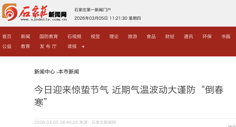 3月5日迎来惊蛰节气,今年惊蛰期间,石家庄市天气整体呈温暖态势,但弱冷空气活动频繁,市民需谨防“倒春寒”,注意防寒保暖,预防季节性流行疾病。